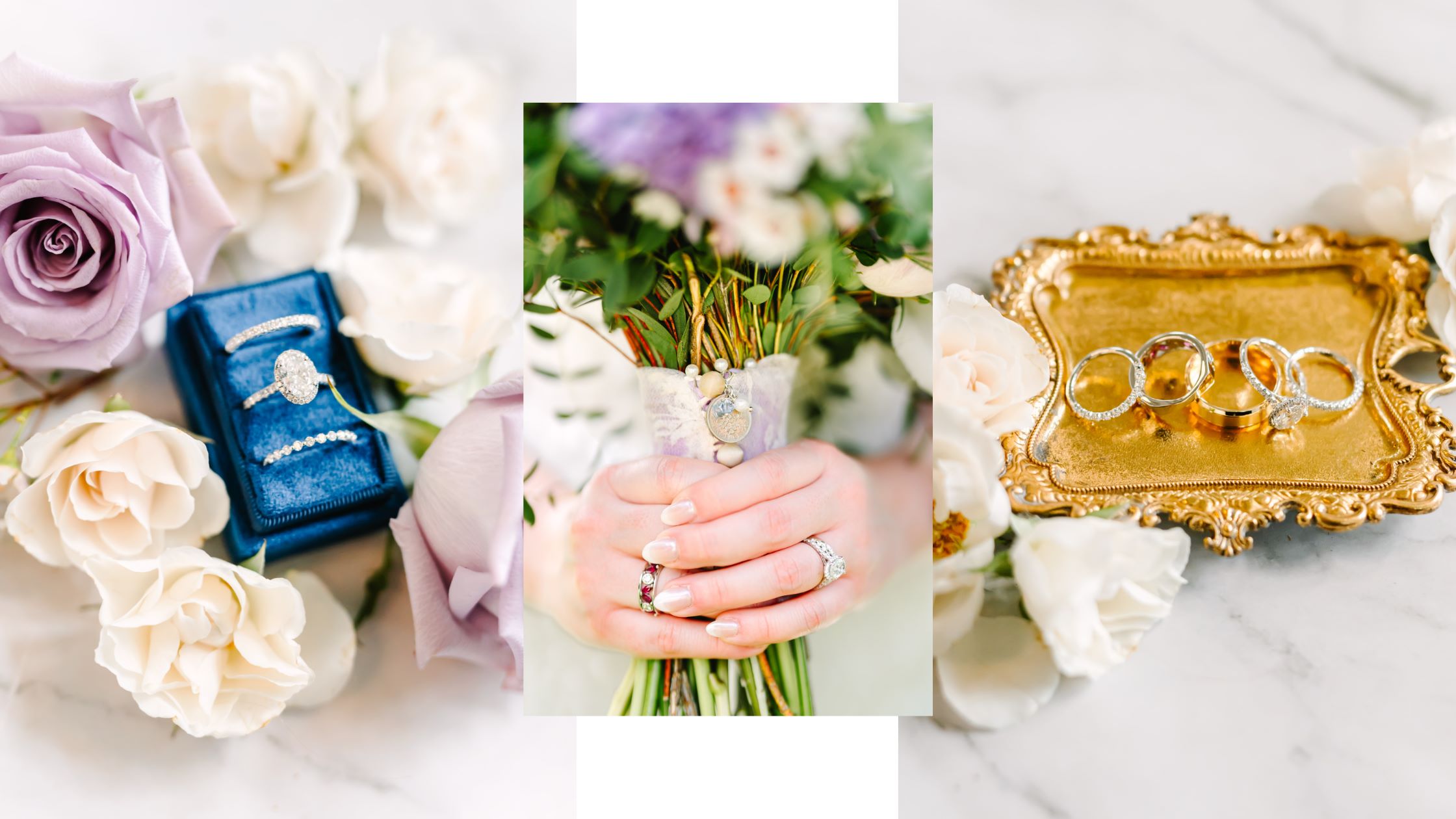 Her Rings: Jessica’s engagement ring is a custom Fana oval halo with two complimenting diamond bands set in white gold.